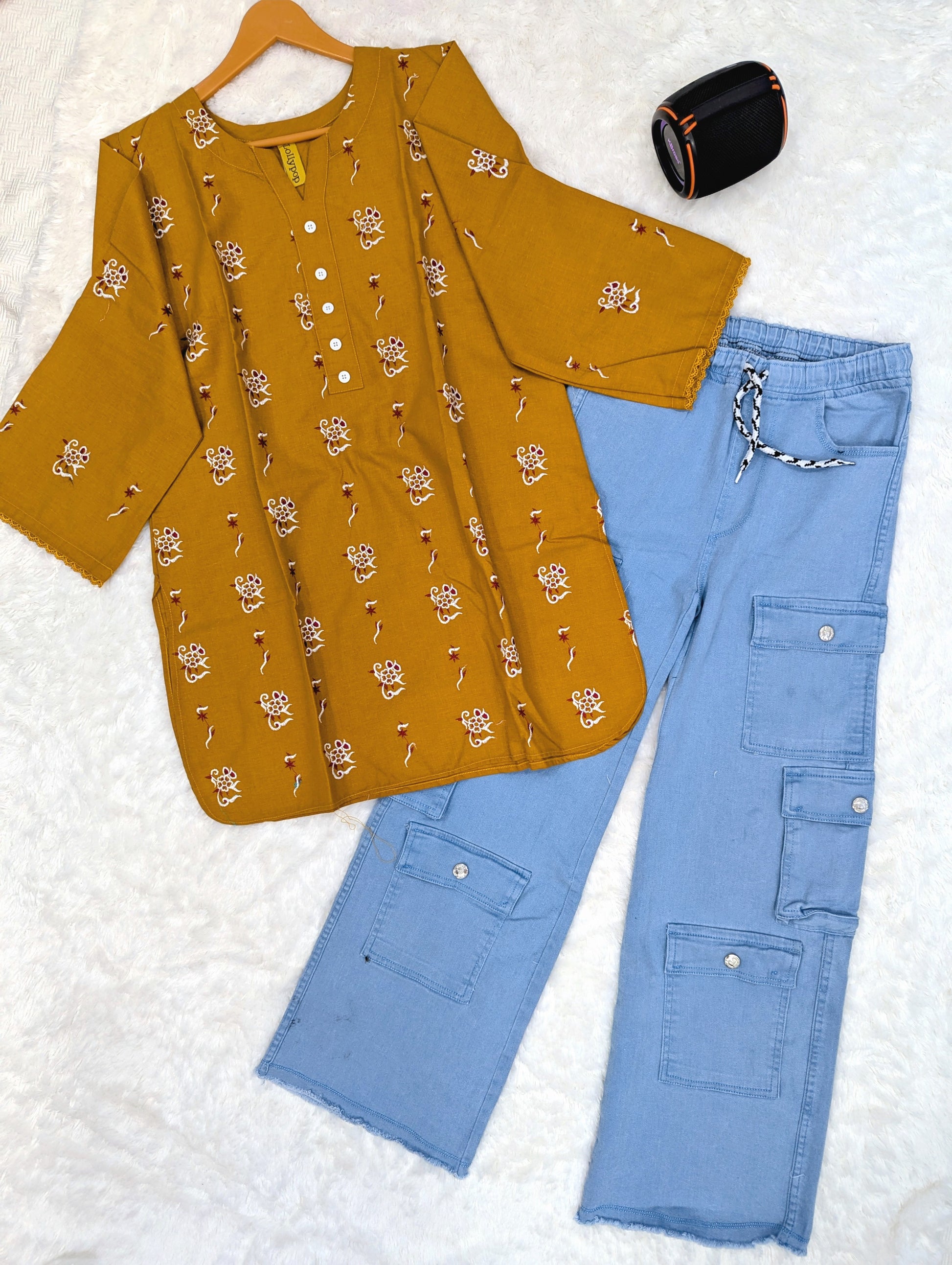 Color: Mustard Yellow Kurti + Sky Blue Cargo Pants